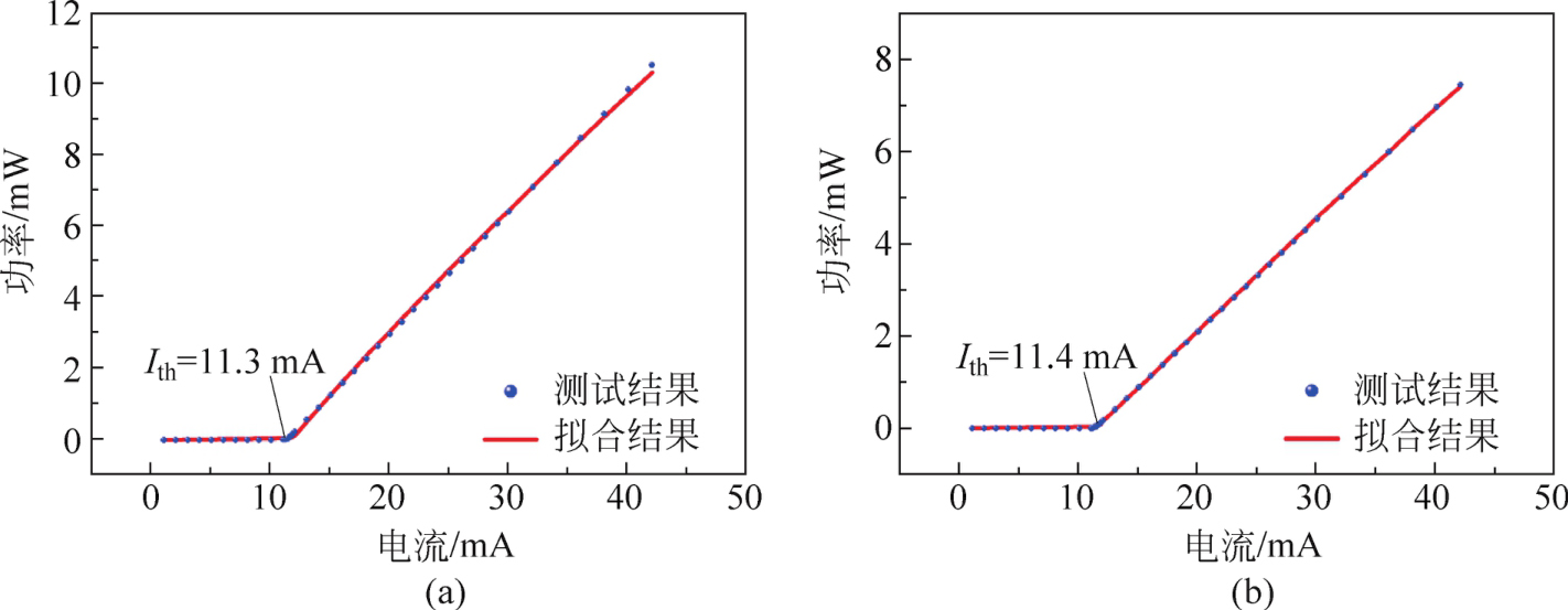 图2-11(a)是半导体激光器芯片1的拟合结果,图2-11(b)是半导体激光器芯片2的拟合结果。图中蓝色曲线是实验测试曲线,红色曲线为拟合曲线,拟合曲线和实验曲线吻合得较好,拟合得到的参数见表2-2。