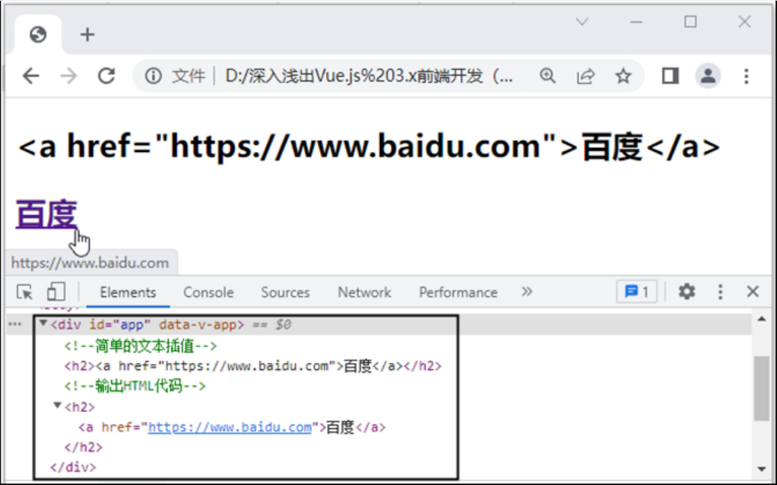 在Chrome浏览器中运行程序,按F12键打开控制台并切换到Elements选项卡,可以发现使用v-html指令的p标签输出了真正的a标签,当单击“百度”后,将跳转到对应的页面,效果如图2-2所示。