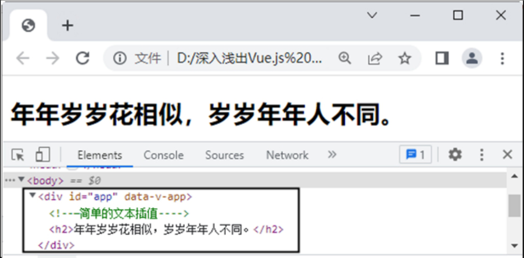 在Chrome浏览器中运行程序2.1.html,按F12键打开控制台并切换到Elements选项卡,可以查看渲染的结果,如图2-1所示。