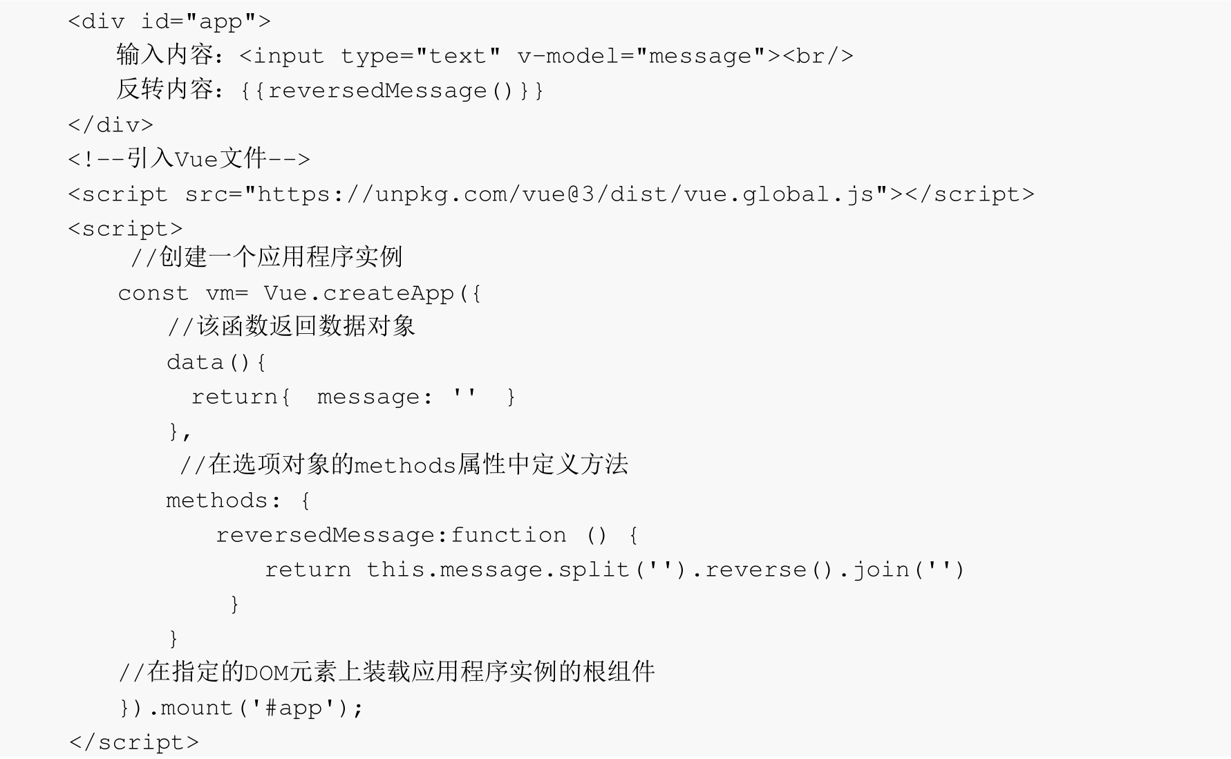 在input中通过v-model指令双向绑定message,然后在methods选项中定义reversedMessage方法,让message的内容反转,然后使用插值语法渲染到页面中。