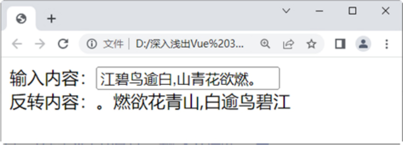 在Chrome浏览器中运行程序,然后在文本框中输入“江碧鸟逾白,山青花欲燃。”,可以看到下面会显示反转后的内容“。燃欲花青山,白逾鸟碧江”,如图3-1所示。