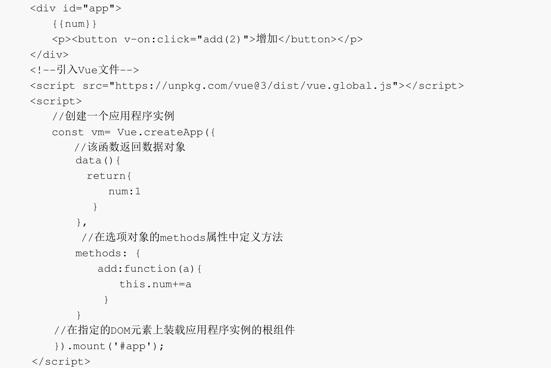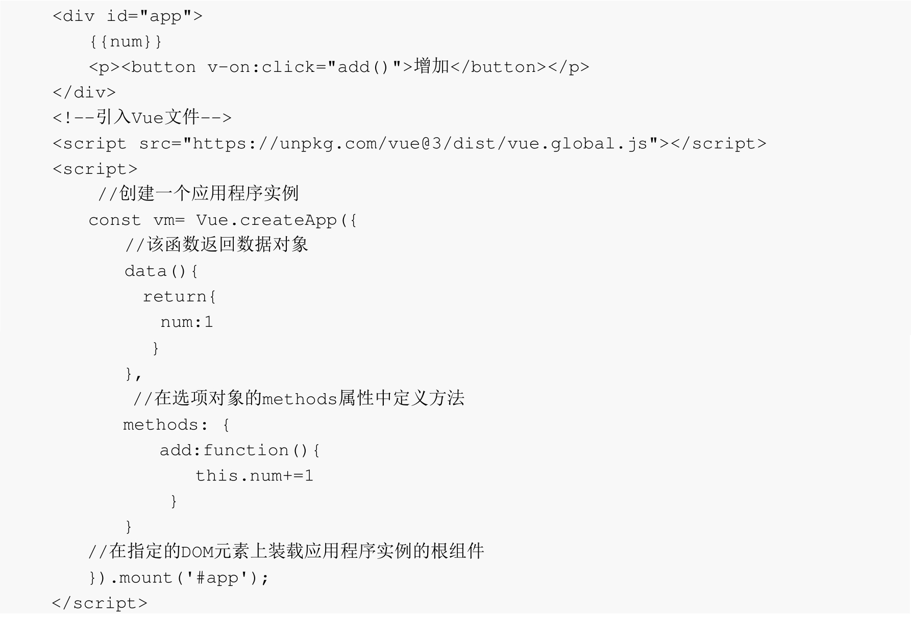 首先在data()函数中定义num属性,然后在methods中定义add()方法,该方法每次调用num都会自增。在页面中首先使用插值渲染num的值,使用v-on指令绑定click事件,然后在事件中调用add()方法。