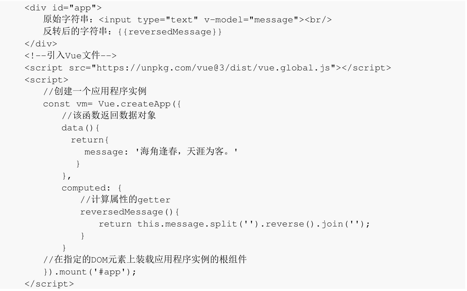上面的插值语法中的表达式调用了3个方法来实现字符串的反转,逻辑过于复杂,如果在模板中还要多次使用此处的表达式,就更加难以维护了,此时应该使用计算属性。