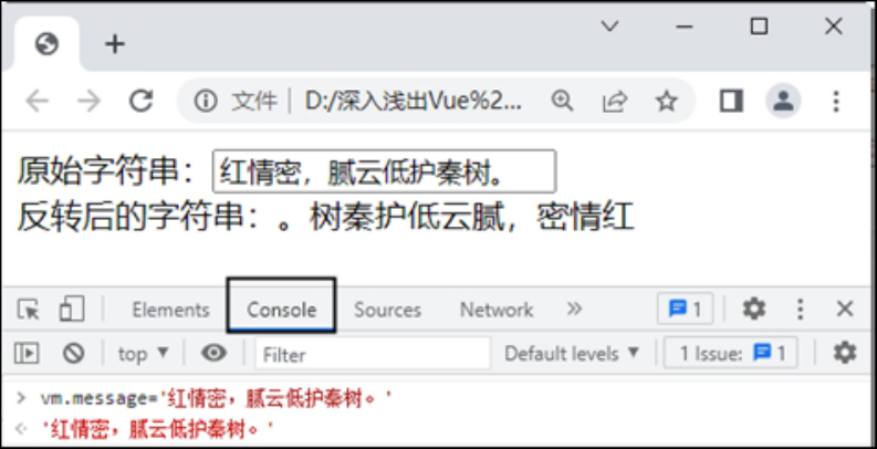 在浏览器的控制台中修改message的值,按回车键执行代码,可以发现reversedMessage的值也发生了改变,如图3-6所示。