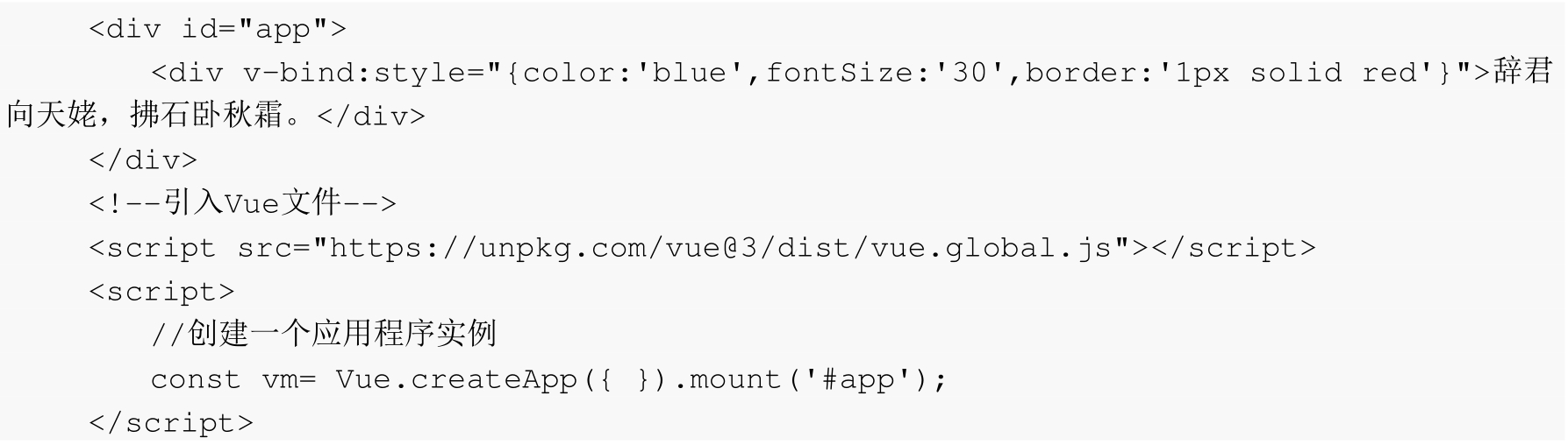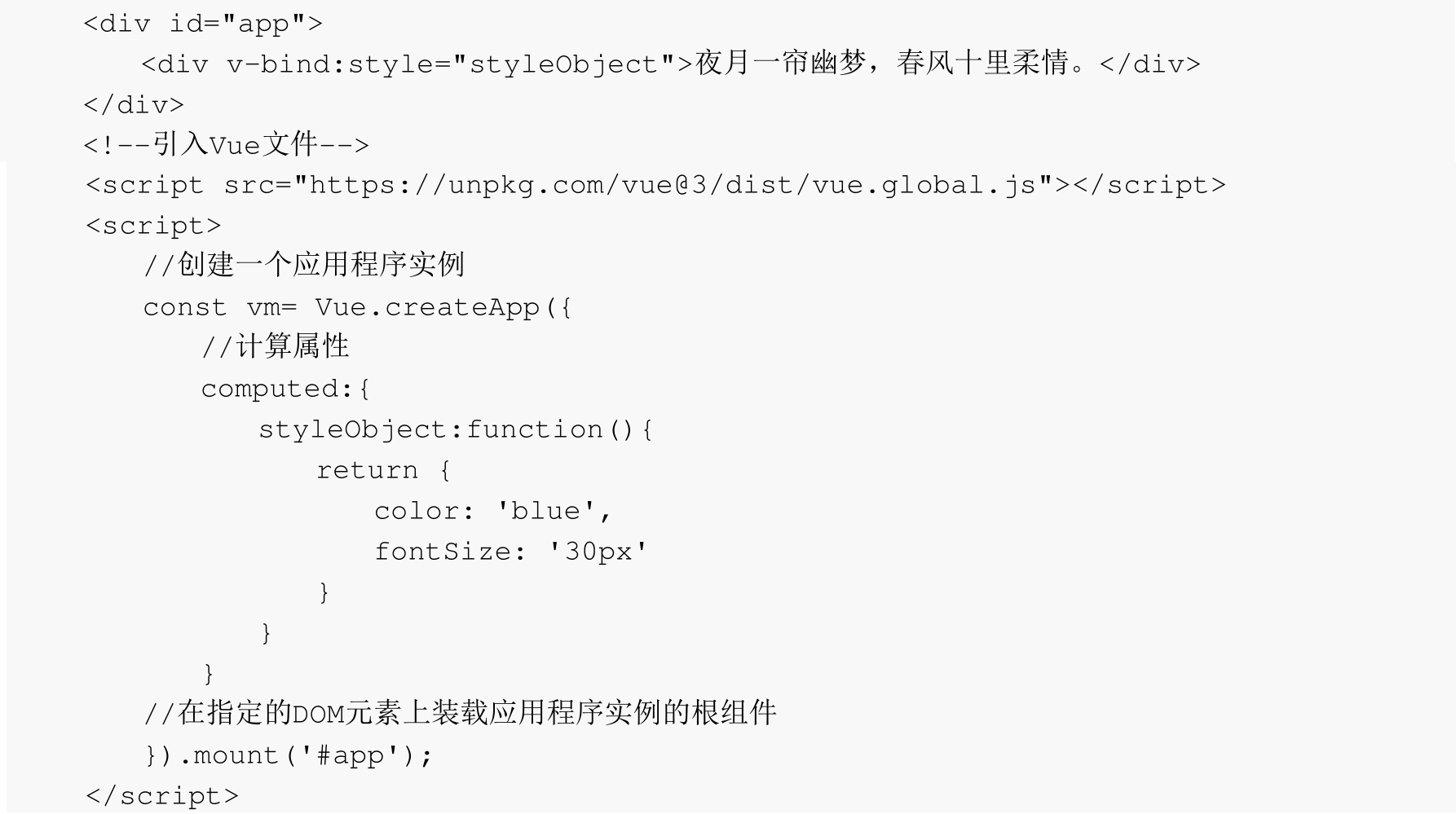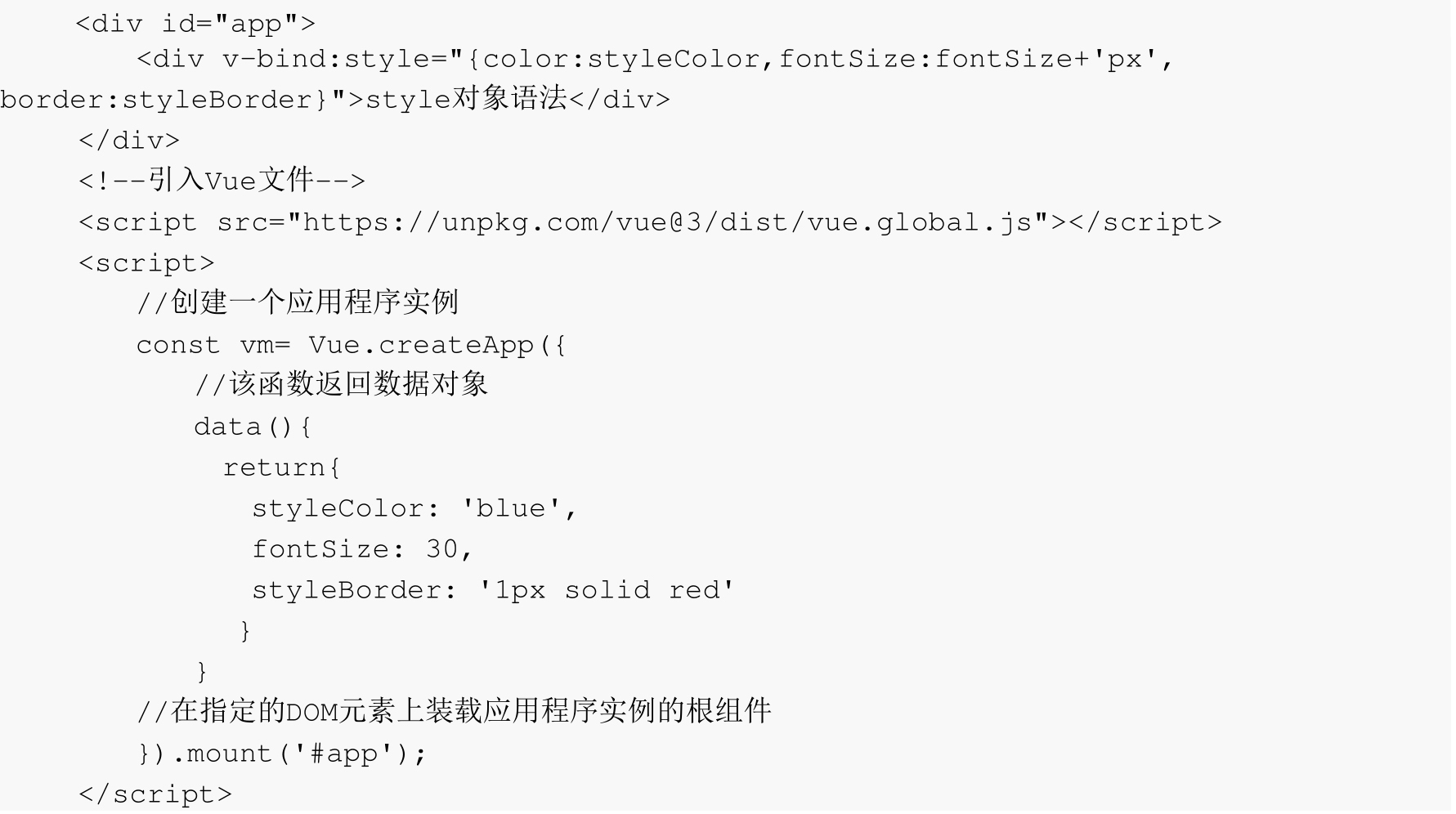 也可以在Vue实例对象中定义属性,用来代替样式属性,例如下面的示例代码: