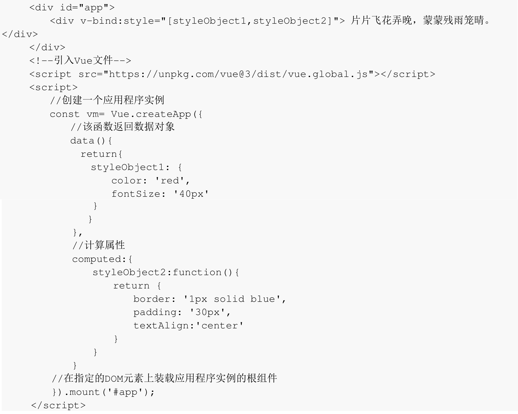 v-bind:style的数组语法可以将多个样式对象应用到同一个元素上,样式对象可以是data中定义的样式对象和计算属性中return的对象。示例代码如例3.15所示。