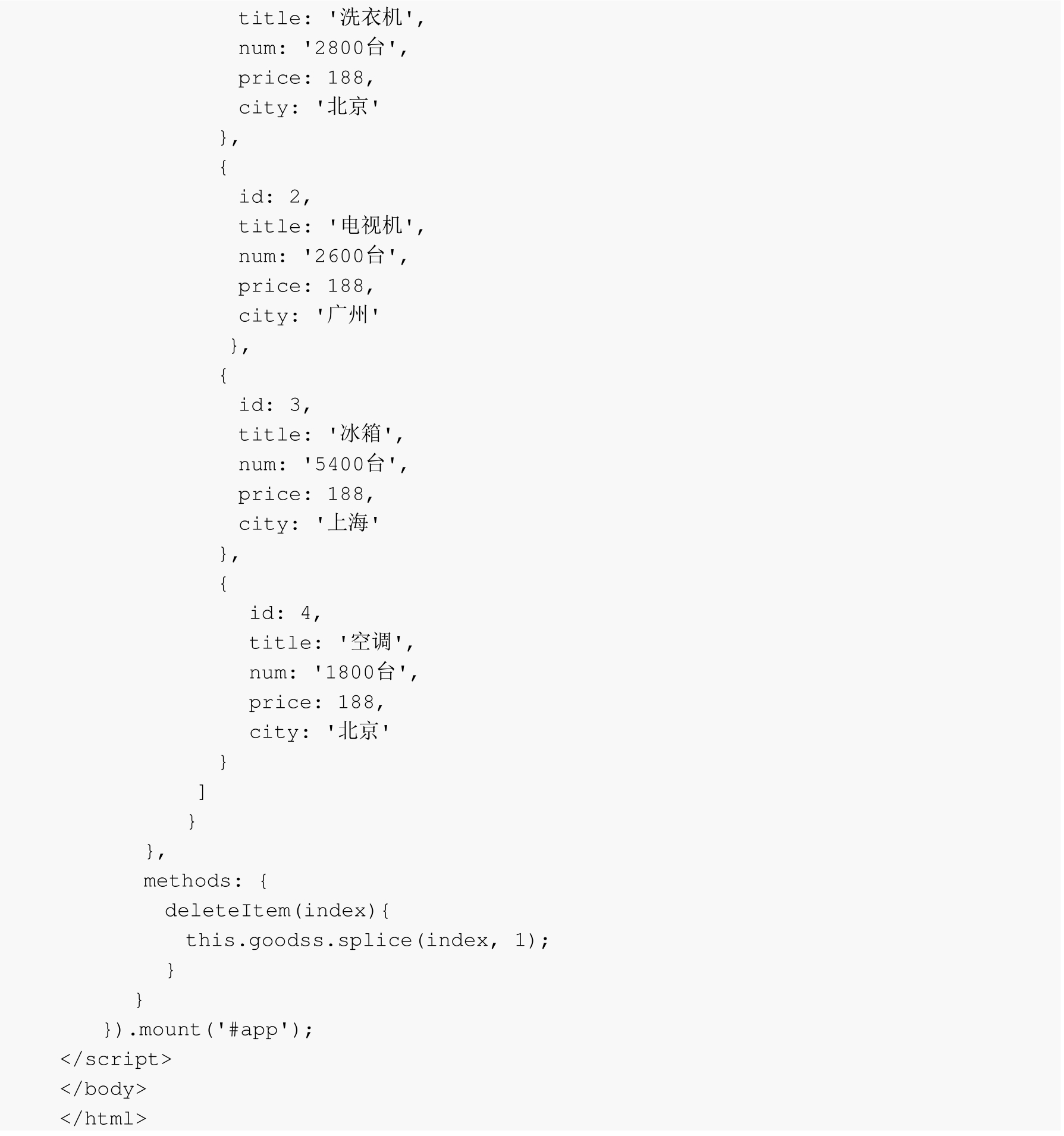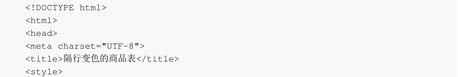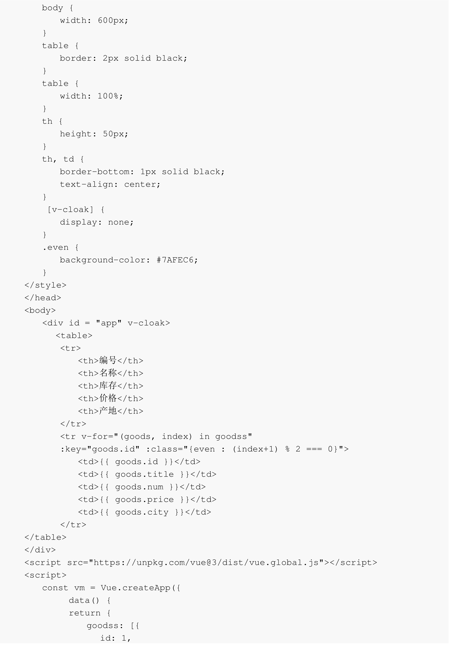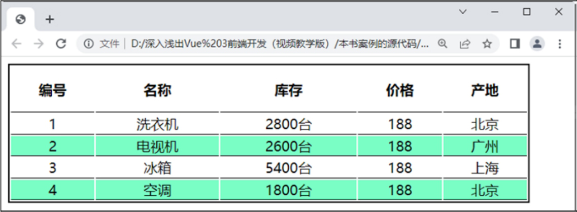 该案例主要是设计隔行变色的商品表,针对奇偶行应用不同的样式,然后通过v-for指令循环输出表格中的商品数据。案例代码如例3.16所示。