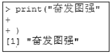 (3)在R Console中编写代码无法直接通过鼠标拖曳改变代码的位置。例如,输入代码“print("奋发图强")”后,无法通过鼠标将“发”拖曳到“奋”前,选中“发”后按Delete键也无法将其删除,只能通过键盘上的左右方向键改变光标位置,按Backspace键进行删除。通过按键盘上的上下方向键可以显示上一行或下一行代码。