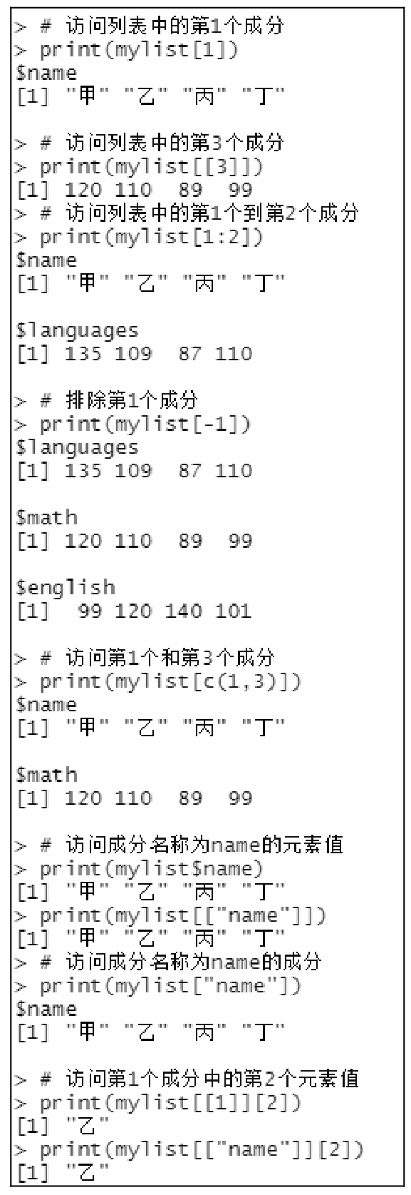 使用列表索引可以对列表中的元素进行访问、编辑或删除。访问列表元素需要使用双重方括号“[[]]”来指明成分或使用成分的名称及位置进行访问。
