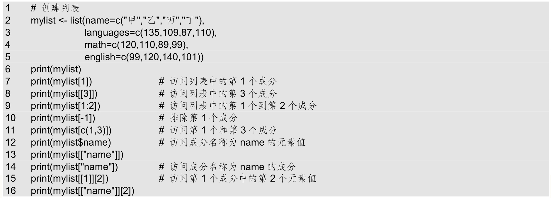 列表是R语言数据结构中最复杂的一种。一般来说,列表是一些对象(或成分)的有序集合。列表允许整合若干(可能无关的)对象到单个对象名下。例如,某个列表中可能包含若干向量、矩阵或数据框,甚至是包含其他列表的组合。