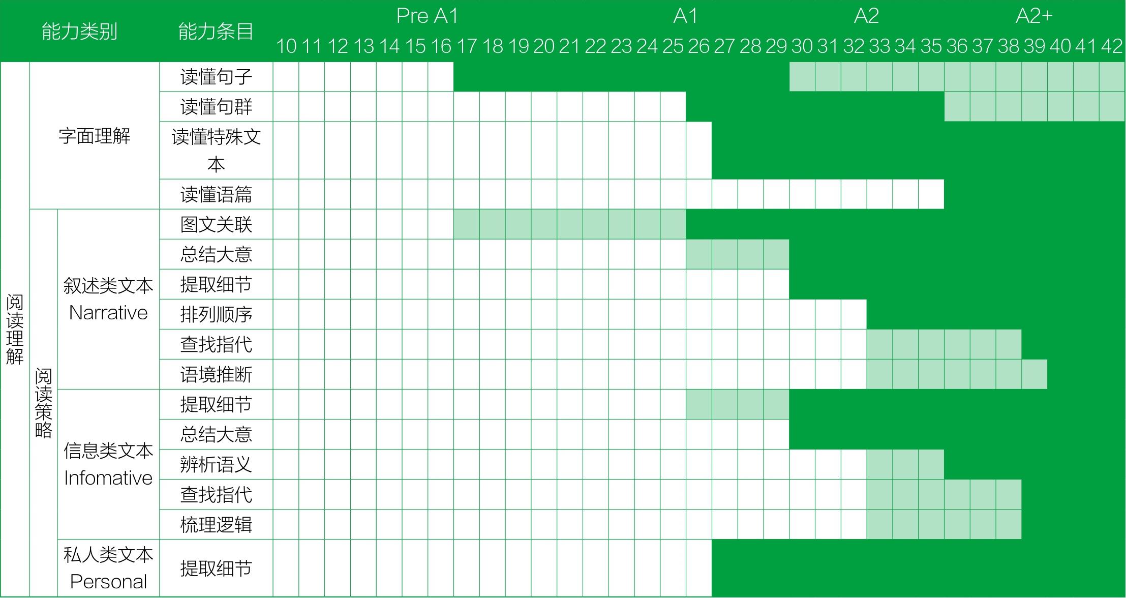 解码能力 培养相关的能力排序为:认读单词、短语、句子,掌握自然拼读知识,认读句群和语篇等。认读单词的能力基本与“认得单词”同步发展,能力起点对标GSE Pre A1阶段的起点,通常在学习新词的同时通过跟读活动帮助学习者认读单词。认读短语和认读句子的能力则依次晚于前一能力,在教学中可以与口语能力中“跟读短语”和“跟读句子”的能力相对应,跟读能力的培养能够有效辅助学习者培养认读能力。自然拼读知识在认读能力培养的同时一并教学发展,在语言知识模型中有更详细的呈现,从开始教学到掌握基本会跨越GSE Pre A1阶段至A1阶段结尾。认读句群和认读语篇能力的发展则远晚于以上的前序能力,这两项能力不仅对学习者的解码能力有要求,也对学习者的阅读熟练度有要求。通常,学习者在拥有阅读语篇能力时方能完全内化这一能力、自动完成对语篇内单词音、形、义的匹配。