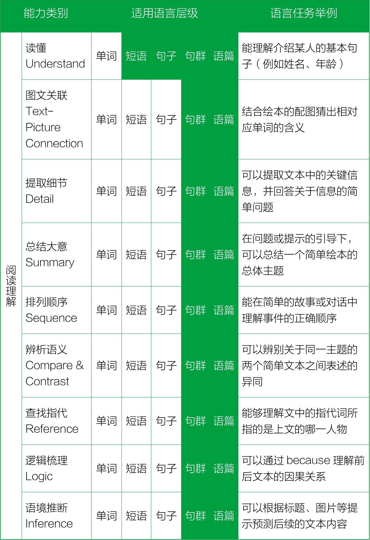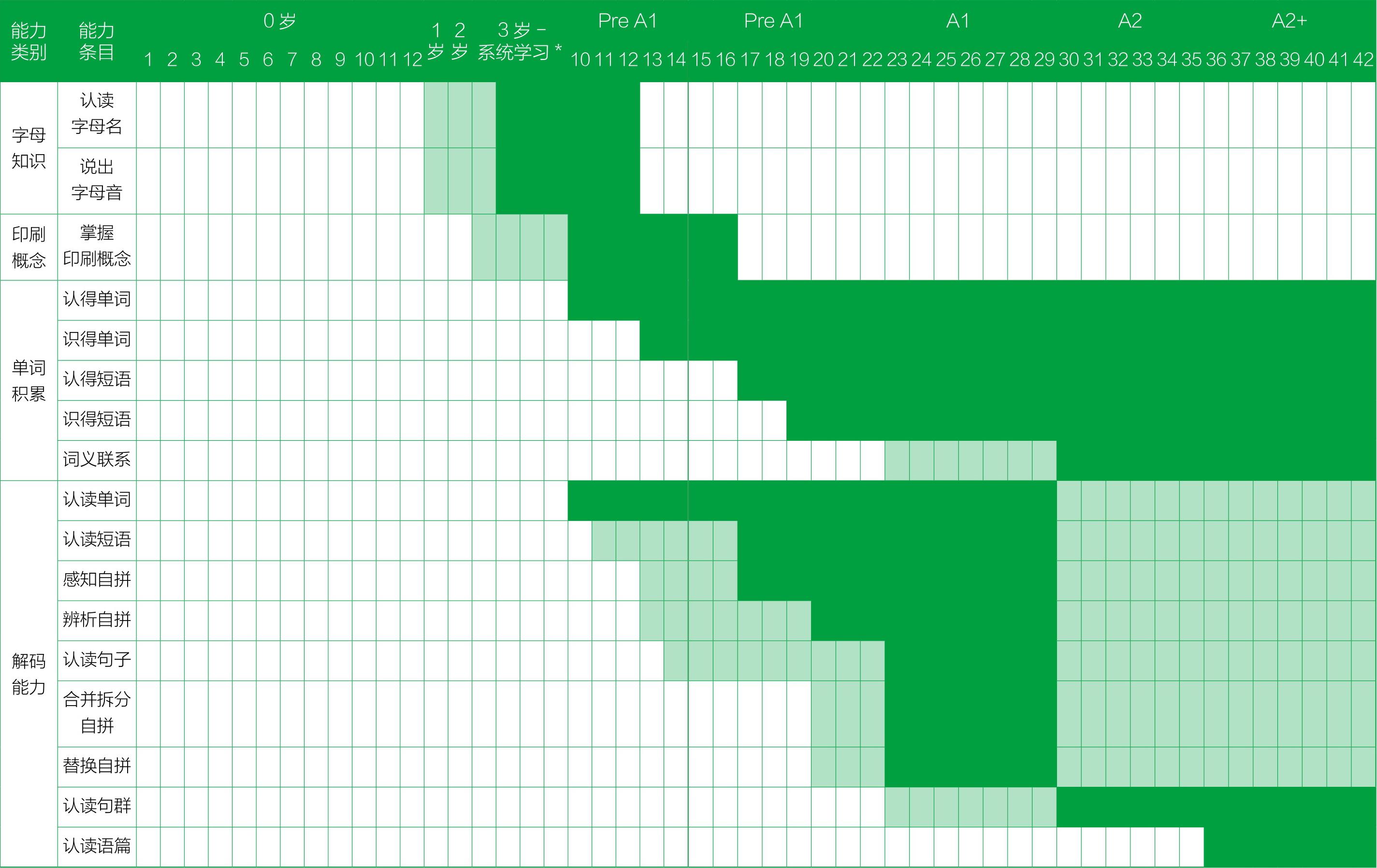 与听力能力及口语能力类似,阅读能力在学龄前或系统学习英语之前的语言发展阶段以年龄作为参考刻度,系统学习英语之后的语言能力进阶则以GSE的阶段作为参考刻度,本节将依序介绍阅读能力中各层能力的发展顺序和时间。阅读能力中包含几项同步发展的能力类别,比如文本基础能力中,与单词积累相关的能力和与解码能力相关的能力培养同步推进,阅读理解能力中,不同文本类型的阅读策略也会同步发展,下面将具体阐述说明。
