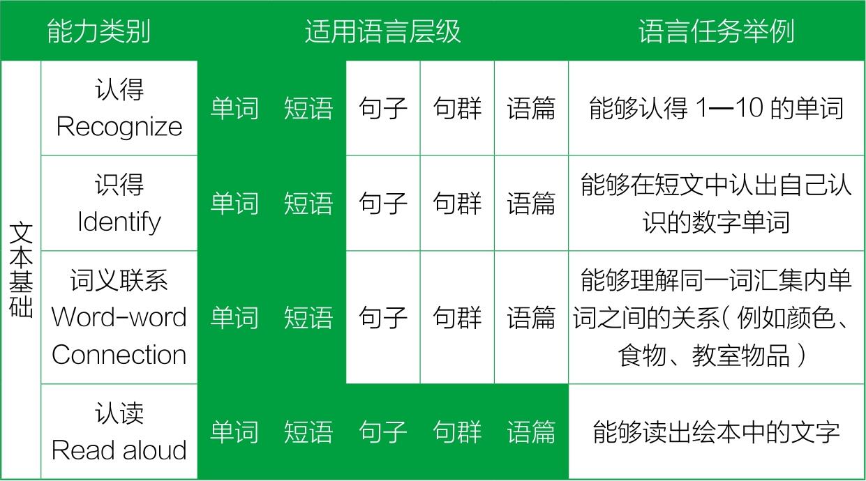 文本基础能力包含字母知识、印刷概念、单词积累、解码能力等几项能力(见表2-13),字母知识与印刷概念的发展先于单词积累和解码能力培养,后两者则相对平行。