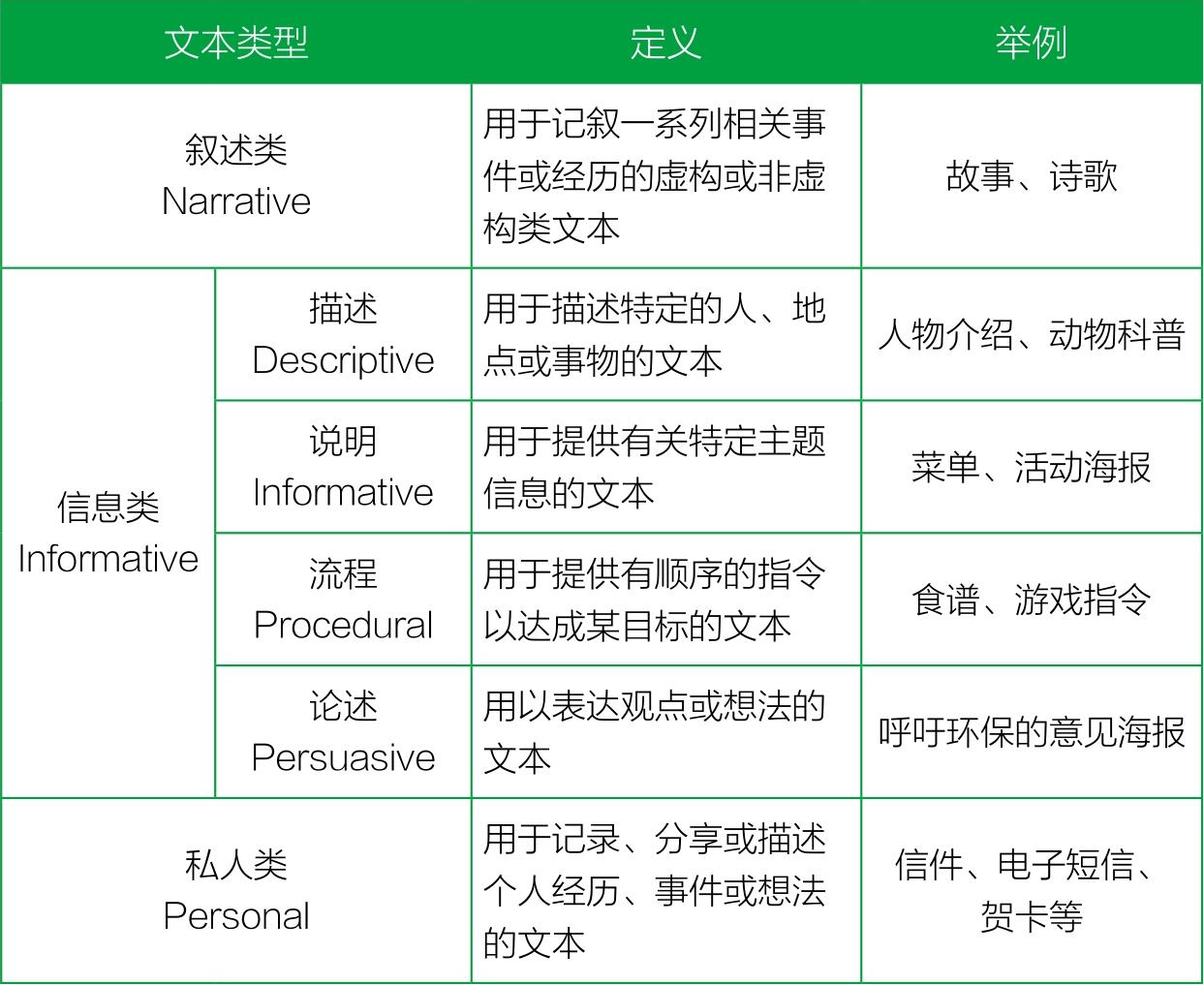 信息类 文本可分为四个子类别:描述、说明、流程、论述类文本。描述类文本指用于描述特定的人、地点或事物的文本,比如对某个历史人物的介绍、某种动物或植物的科普等,更短的文本则包括对生活中某一物体的特征描述、寻物启事的一段描述等,相比于叙述类文本,此类文本的故事性相对较弱。说明类文本指用于提供有关特定主题信息的文本,比如活动海报、菜单等,此类文本可以通过任意形式呈现,书写者与读者通常有默认共享的语境,文本的重点在于清晰传递读者所需要的信息。流程类文本是用于提供有顺序的指令以达成某目标的文本,比如指导做菜的食谱、游戏指令等。在一些分类中,流程类文本会归于说明类文本,但由于流程类文本有其特殊的结构,在此特做区分,以便教学者在实际教学场景中引起注意。还有一类是论述类文本,主要用于表达书写者的观点或想法,可以是围绕一个论题展开的一系列并列关系观点,也可以是层层递进的信息,内容通常包含论点和论据,阅读此类文本时对语义的辨析能力和逻辑梳理能力的要求较高。
