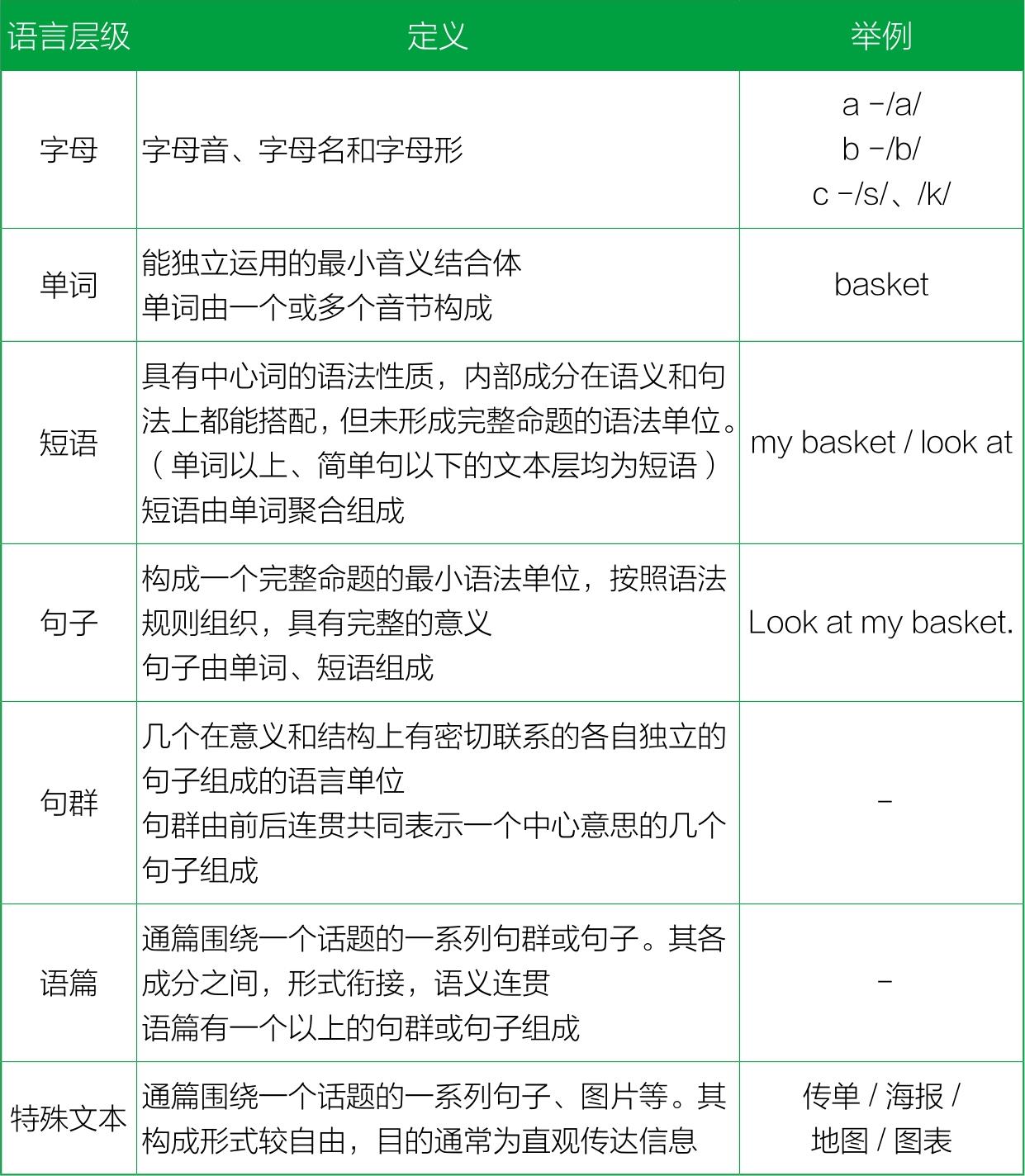 句子 的定义也与听力、口语能力中相同,是构成一个完整命题的最小语法单位。句子按照语法规则组织,具有完整的意义,由单词、短语组成。阅读能力培养的重点在很长一段时间都会留于句子层面,而后随着阅读熟练度的提升逐步进阶到句群和语篇阅读阶段。