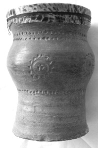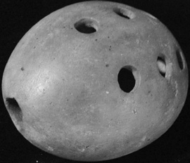 ,则有可能是狩猎时模仿动物鸣叫以便诱猎的工具;陶制的盛物器皿本身就可以敲击,口部蒙上动物的皮则成了“陶鼓”。发音工具的长期使用,使人们逐渐掌握了发音的手段,审美听觉也得到了开发。山西万荣县荆村出土的新石器时代的陶埙,已能分别吹奏出小三度、纯五度音程,而距今八千多年的舞阳骨笛多达七个音孔,这反映了我们祖先最初的音高、音程感的形成,以及民族音乐审美在听觉上的朦胧意识。