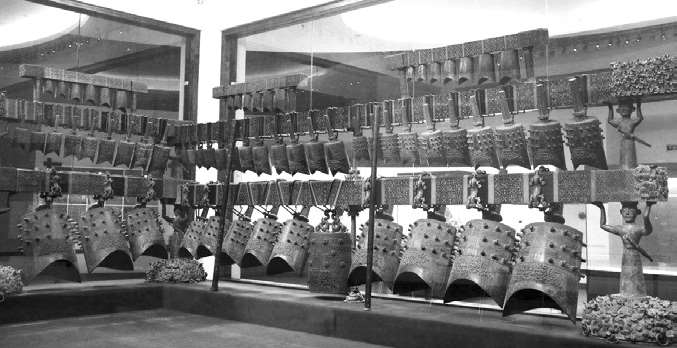 这一时期经历夏、商、西周到春秋、战国、秦汉,为中国音乐以后的发展奠定了基础,其最具有代表性意义的音乐形式是钟鼓乐队。夏代开始,我国进入奴隶制社会,社会制度在乐舞中得到反映。夏商时期的乐舞,展现的是人们对征服自然的人的颂歌,如《大夏》歌颂开国君主大禹治水功绩;商代乐舞《大闱》,炫耀成汤伐舜的武功,目的是通过对统治者的歌功颂德,起到肯定王权、巩固奴隶制统治的作用。商代产生了专司乐舞的“巫”及“觋”,他们成为中国最早的专业音乐舞蹈家,并促进了乐舞艺术的提高发展。这是随着生产力的发展,社会分工在音乐中的体现。至殷商时期,从出土文物及甲骨文字看,中国已出现了十余种敲击乐器和吹管乐器,并有可能还有了弹弦乐器。如编磬、铙,铎、铃、钟、镛等。其中最著名的是殷墓出土的曾侯乙偏钟(图1-7)。