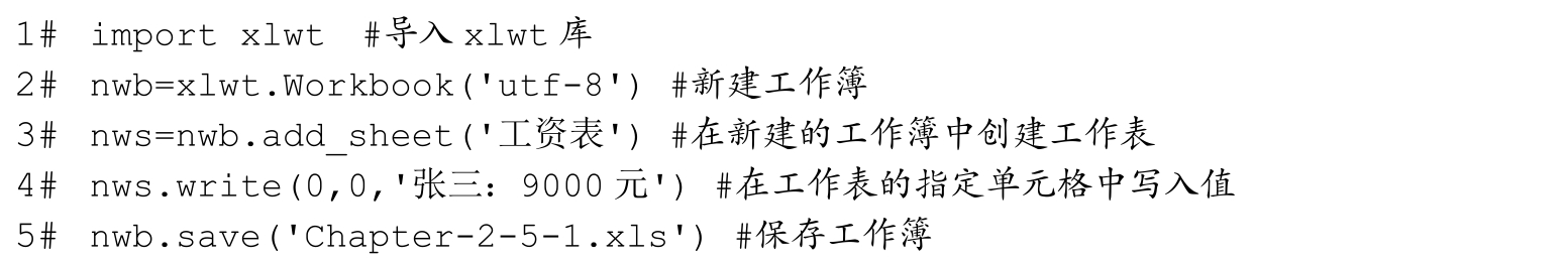 第5行代码 nwb.save('Chapter-2-5-1.xls') ,表示保存新建的工作簿,工作簿名称为“Chapter-2-5-1.xls”。注意,xlwt库暂时只支持保存为.xls格式,不能保存为新版的.xlsx格式。