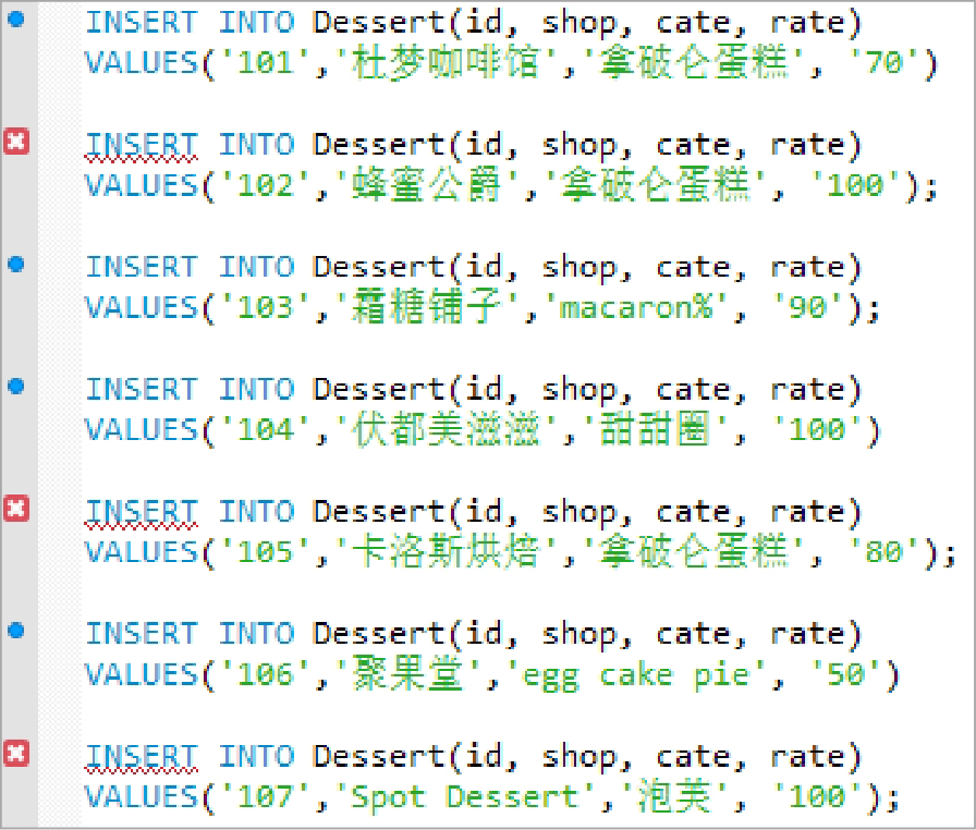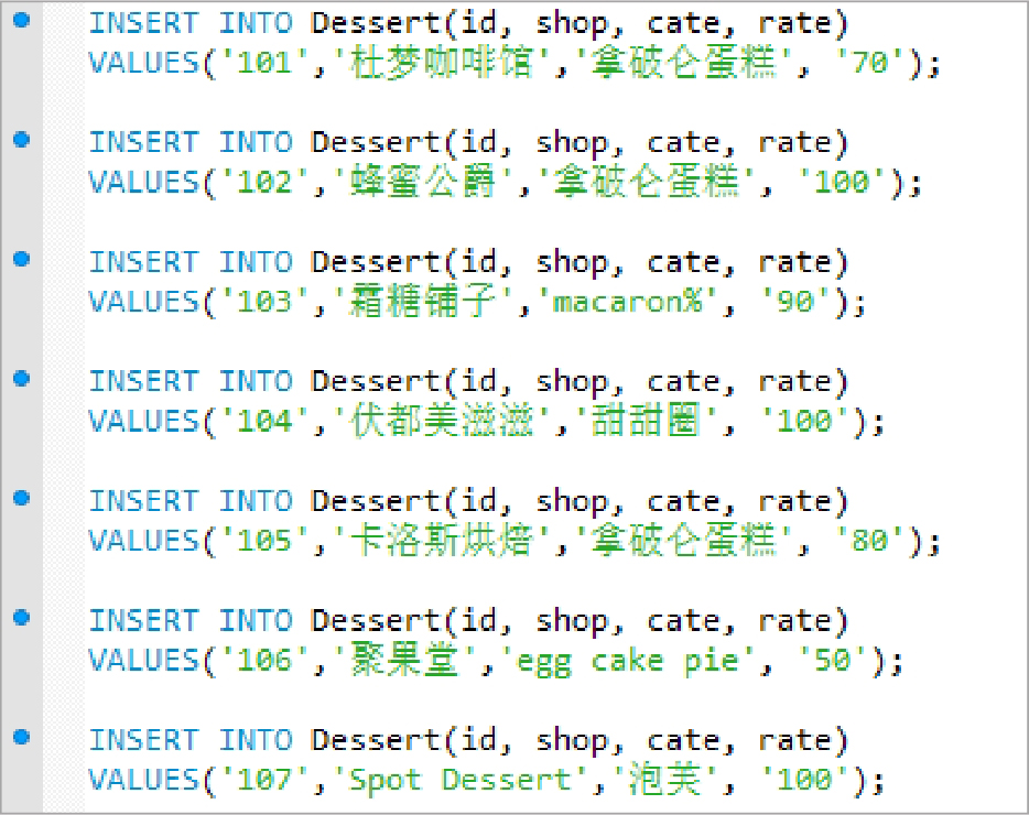 这是因为分号的实际含义是分隔符,它会将一众语句分割成独立的执行单位,以供MySQL识别。这类似于在检索语句中,我们会使用逗号将各个列名隔开一样。事实上,当大家向样例表中插入数据时,正是在批量执行SQL语句(由INSERT引导的SQL语句),例如: