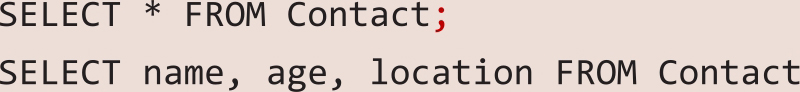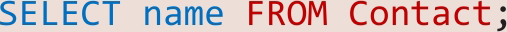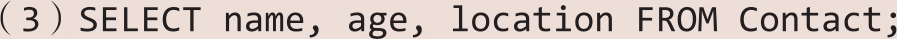 8. 正如本章导读中所提到的:关键词SELECT就像一只看不见的手,它随时听候我们的调遣,预备抓取信息。没错,但是想必同学们都很清楚,抓取这一行为的前提是告知从何处抓取,也就是事先告知这只手该伸向哪里。举例来讲,如果李乔丹想查看姑娘们的姓名信息,那么毫无疑问,Contact表中的name列就是被抓取的对象,而Contact表本身则是伸手操作的目标: