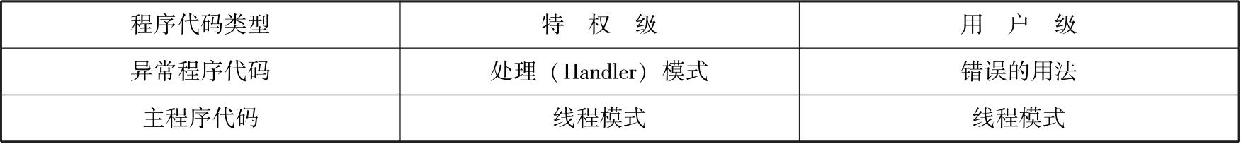 在CM3运行主程序代码(线程模式)时,既可以使用特权级,又可以使用用户级,但是异常程序代码必须在特权级下执行。复位后,处理器默认进入线程模式特权级访问。在特权级下,程序可以访问所有存储器,并且可以执行所有指令,但若有存储器保护单元(MPU),则MPU规定的“禁地”不能访问。特权级下的程序功能比用户级多一些。一旦进入用户级,用户级的程序不能简单地试图改写控制寄存器(详见2.3节)就返回特权级,它必须先执行一条系统调用指令(SVC),这会触发SVC异常(详见2.8节),然后由异常程序代码(通常是操作系统的一部分)接管,如果批准进入,则异常程序代码修改CONTROL寄存器,只有这样才能在用户级的线程模式下重新返回特权级。