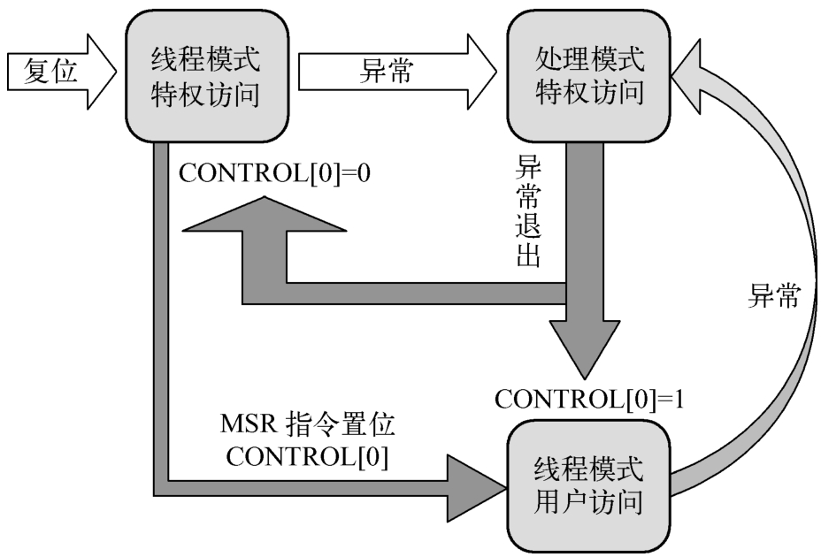 CM3下的工作模式和权限如表2-1所示。工作模式转换图如图2-3所示。