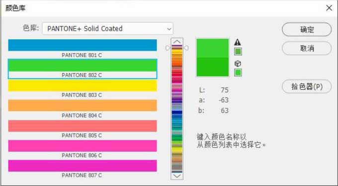 在颜色色相区域内单击或拖曳两侧的滑块,可以使颜色的色相产生变化。在颜色选择区中选择带有编码的颜色,在对话框的右侧上方颜色框中会显示所选择的颜色,右侧下方是所选择颜色的L、a、b的值。