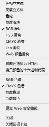 图标,系统将弹出“颜色”控制面板的菜单,如图1-88所示。此菜单用于设定控制面板中显示的色彩模式,可以在不同的色彩模式中调整颜色。