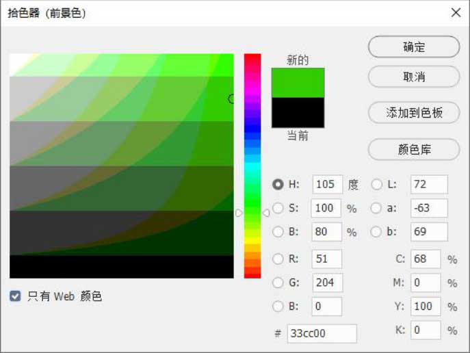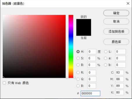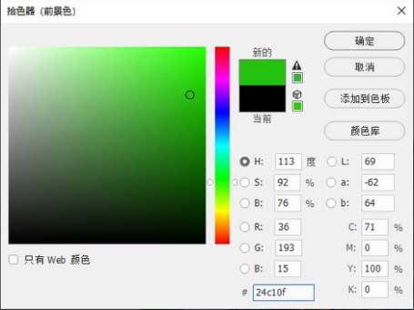 选择好颜色后,在对话框右侧上方的颜色框中会显示所选择的颜色,右侧下方是所选择颜色的H、S、B,R、G、B,L、a、b,C、M、Y、K的值,单击“确定”按钮,所选择的颜色将变为工具箱中的前景色或背景色。