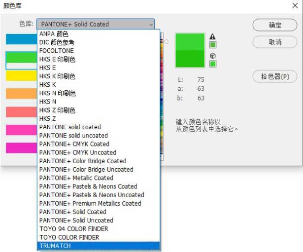 ,弹出“颜色库”对话框,如图1-77所示。在“颜色库”对话框中,“色库”下拉列表框中是一些常用的印刷颜色体系,如图1-78所示。其中“TRUMATCH”是为印刷设计提供服务的印刷颜色体系。