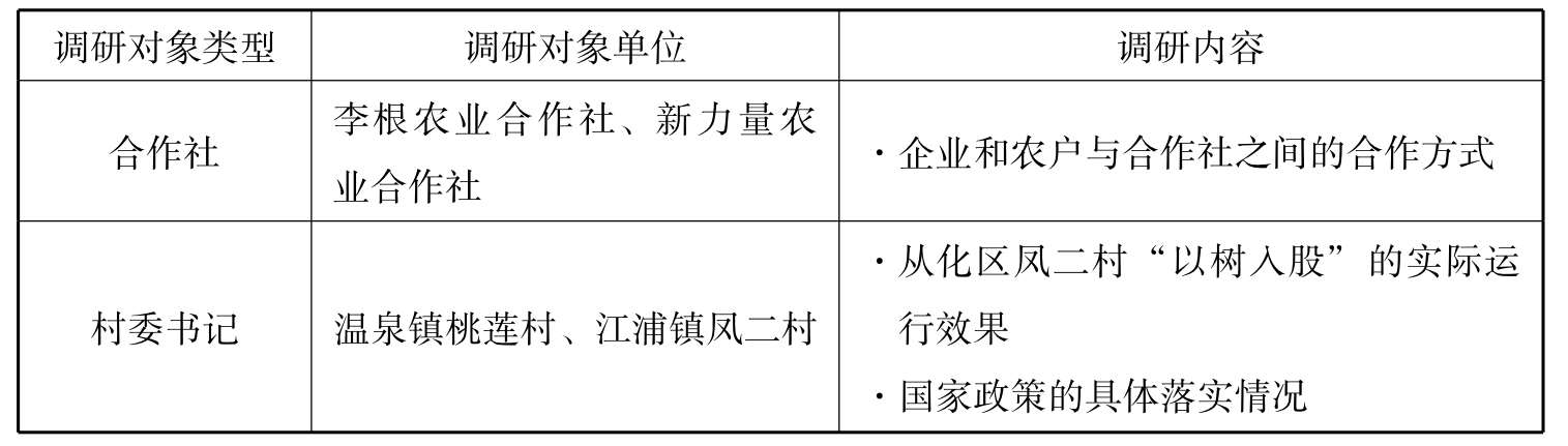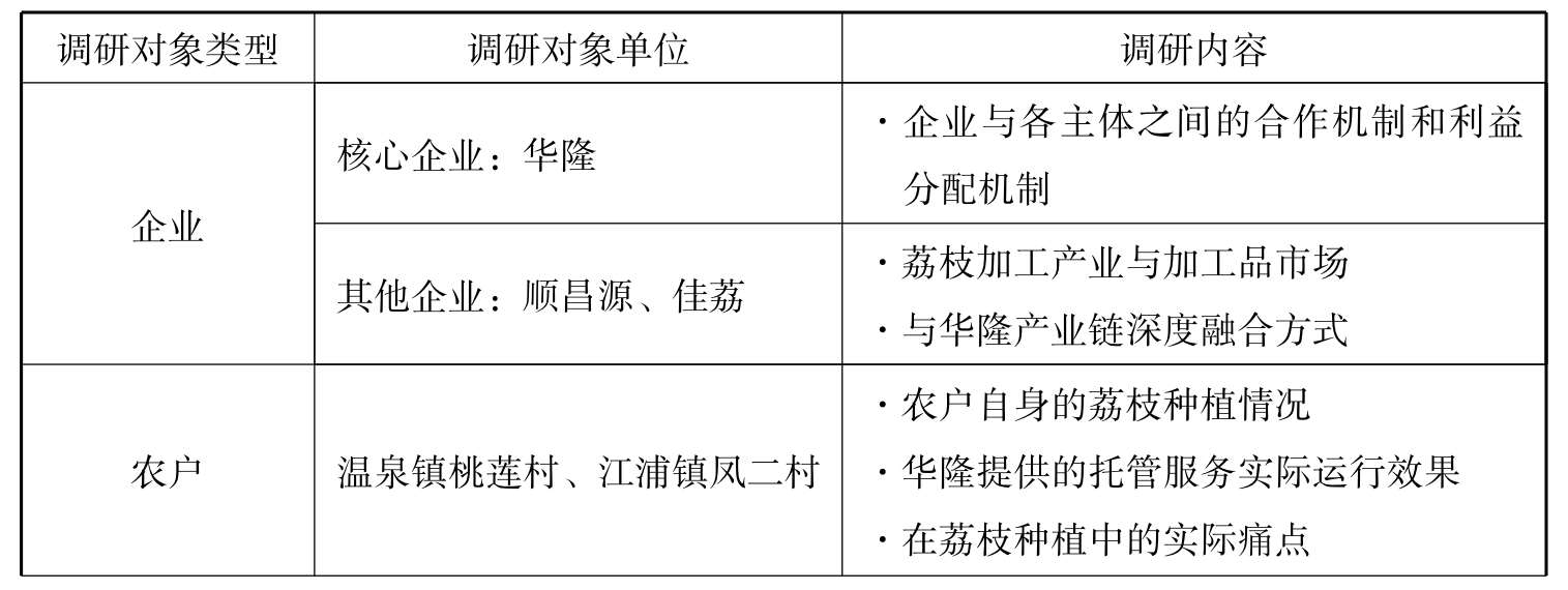 本课题组以从化区华隆,顺昌源、佳荔两个荔枝加工企业,李根、新力量两个合作社,温泉镇桃莲村、江浦镇凤二村的农户、村委为主要调研对象,就从化区荔枝种植产业的现状以及农户自身的荔枝种植情况、荔枝加工产业与加工品市场、企业和农户与合作社之间的合作方式,以及从化区凤二村“以树入股”的实际运行效果等方面进行了调研(见表1)。