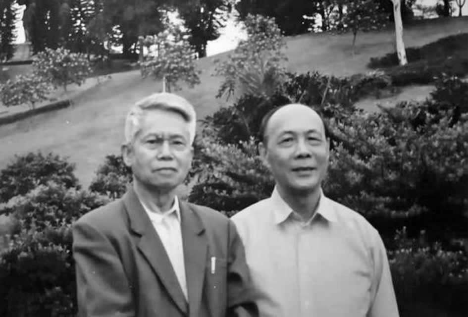 刘才秀(右)与梁江(茂名教育学院副教授)在毕业39周年师生聚会时合影(黄卓才摄,2002年)