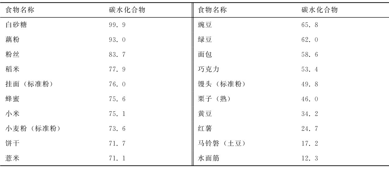 碳水化合物主要来源于植物性食物。多糖主要来源于谷类、根茎类、豆类、坚果类;单糖、双糖除一部分存在于天然食物中外,大多数以成品或半成品的形式直接摄取。动物性食物中,除肌肉和肝外,只有乳类可提供一些碳水化合物。常见食物的碳水化合物含量详见表1-1。