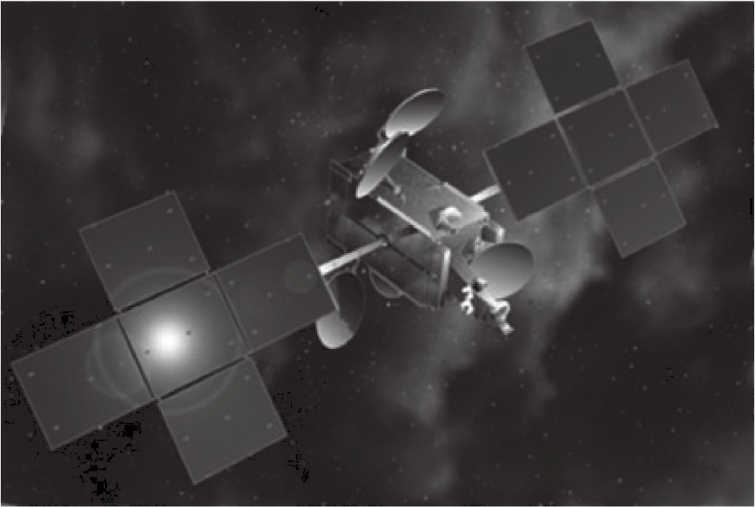 Alphasat卫星是大容量通信卫星,设计研制的目的是要扩大Inmarsat公司现存的全球移动通信网络。卫星由Astrium公司设计制造,并与ESA(欧空局)和Inmarsat公司达成合作研制协议。Alphasat卫星使用Alphabus平台,该平台是由Astrium公司和ThalesAleniaSpace联合签约设计的新型欧洲通信卫星平台。卫星发射重量超过6.6t,太阳翼展开长40m,可提供12kW的功率,外形如图2-4所示。