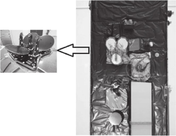 第一个是通信试验载荷设备,配置了37.85~38.15GHz下行、47.85~48.15GHz上行相互铰链的透明转发器,转发器输出功率为10W,天线的接收增益为38.3dBi,发射增益为37.5dBi。该载荷能够形成1个固定点波束和1个可在2个地面站指向间切换的可选波束,外形图如图2-5所示,旨在研究Q/V频段各类自适应传输方案(包括自适应调制编码ACM、上行功率控制ULPC等)的可行性和有效性。