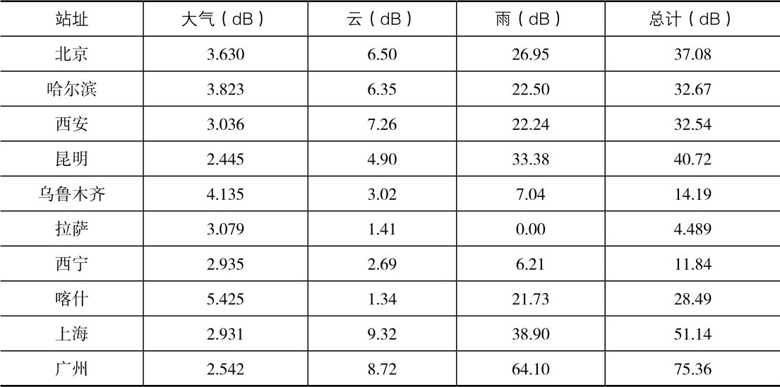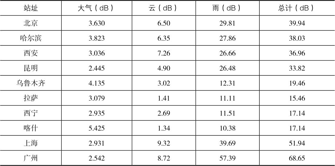 表2-6列出了中国10个主要城市在可用度达到99.9%时,大气、云和雨带来的衰减量,工作频段为V频段(50GHz)。