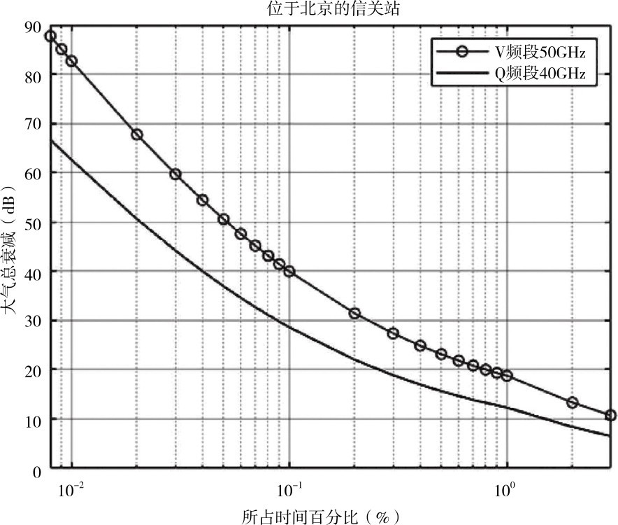 在图2-9中,举例说明位于北京的信关站在40/50GHz的大气总衰减的累积分布函数(CDF),雨衰仿真采用ITU模型。由此可见,为了提供99.9%的可用度,北京信关站在V频段需要40dB的裕度余量。