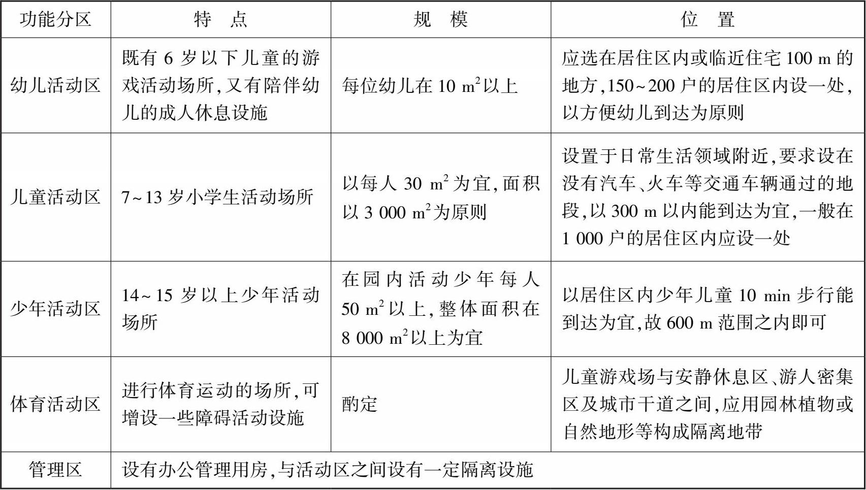 儿童公园功能区一般可划分为幼儿活动区、儿童活动区、少年活动区、体育活动区、园务管理区(表 2.13)。
