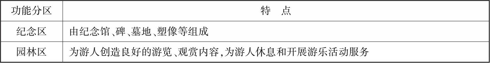 纪念性公园是以技术与物质为手段,通过形象思维而创造的一种精神意境,从而激起人们的思想情感。纪念公园包含革命活动故地、烈士陵墓、著名历史名人活动旧址及墓地等。纪念性公园功能区可参考表 2.14 划分。