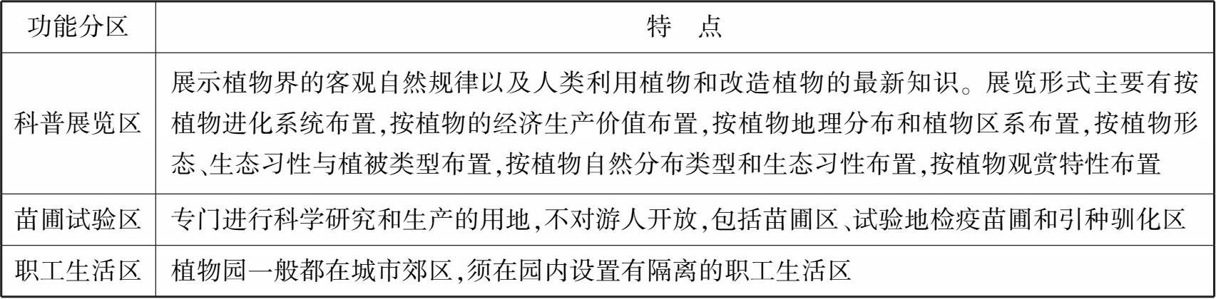 植物园功能分区一般包括以科普为主、结合科研与生产的展览区,以科研为主、结合生产的苗圃试验区,以及职工生活区,相应功能分区及其内涵特点可参考表 2.12。