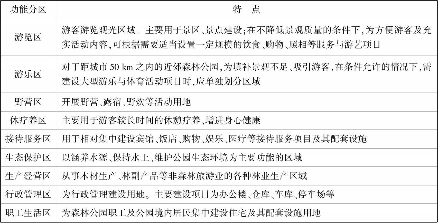 森林公园是以森林及其组成要素所构成的各类景观、各种环境、气候为主的,可供人们进行旅游观赏、避暑疗养、科学考察和研究、文化娱乐,美育、军事教育、体育等活动的大型旅游区和室外空间。森林公园功能分区一般包括游览区、游乐区、野营区、休疗养区、接待服务区、生态保护区、生产经营区、行政管理区、职工生活区(表 2.15)。