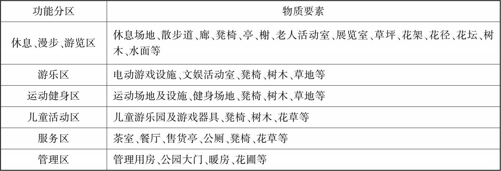 表 2.10 社区公园功能分区与物质构成要素