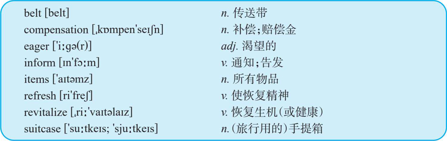 He Li:(Ten minutes later) Sir, don’t worry. I gave my name and my 4. ____ to them. They will 5. ____ me as soon as they find your suitcase. If they can’t find your suitcase, they will make compensation for you. I’ll take you to buy some articles for daily use and some change of clothes when we back to the hotel.