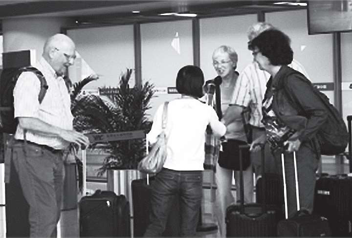 Zhang Ming: You’re welcome. (To tour members) Hello, everyone. Come this way, please. I’m your local guide, James. Welcome to Beijing. The coach is waiting outside.