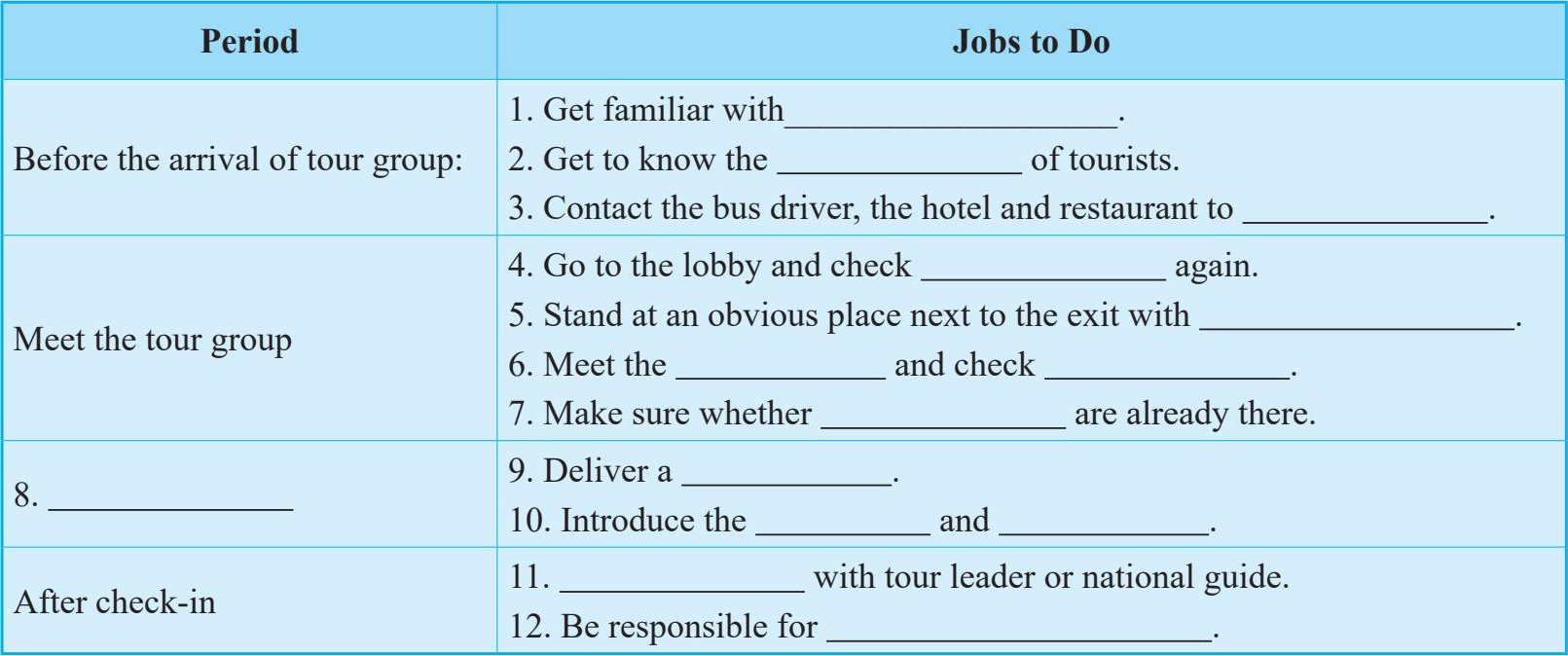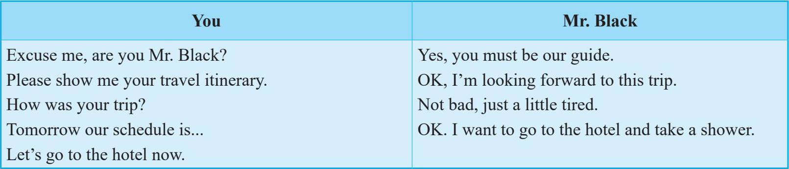 1. Divide the class into several small groups of 2 -4 students. Make dialogues about the process of receiving a tour group. Deal with some emergencies when receiving tourists, such as the guests in the tour group who miss the luggage or pick the wrong group.