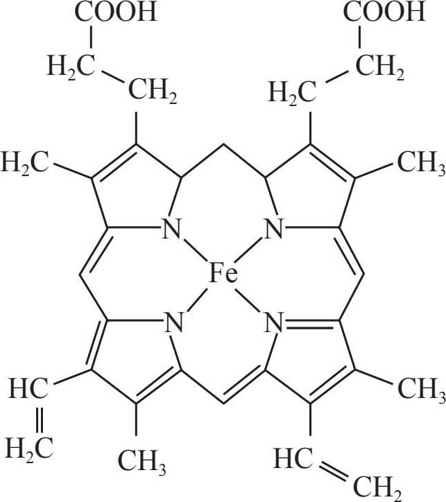 ②天然色素是从动、植物及微生物中提取,有一定的营养或药理作用,一般对人体无害,但色泽、稳定性不如合成色素,成本也比较高。如天然色素中的血红素,它的基本结构(图1.13)是由4个吡咯环连接而成的吡咯环结合1个Fe 2+ ,该化合物具有酸性。由于存在共轭体系,该物质呈现颜色。