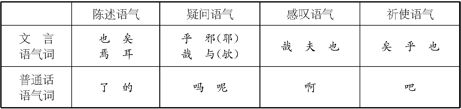 第一,文言中的语气词在普通话中全部更换了。更换的情况如下: