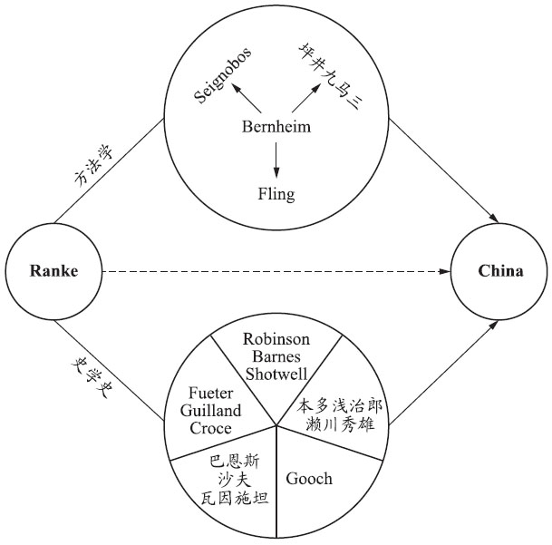 我们认为兰克对中国的直接影响是次要的(用虚线表示),主要端赖间接发生作用,包括两方面:其一,从方法学层面,借助各种史学方法论著作在中国的流传,落实在中国史家的日常治史活动,从而影响于中国近代史学;其二,从史学史层面,透过西方史学史、史学理论著作以及日本西洋史教科书,提升兰克在中国史学界的认知度,传递兰克史学的某些特质。
