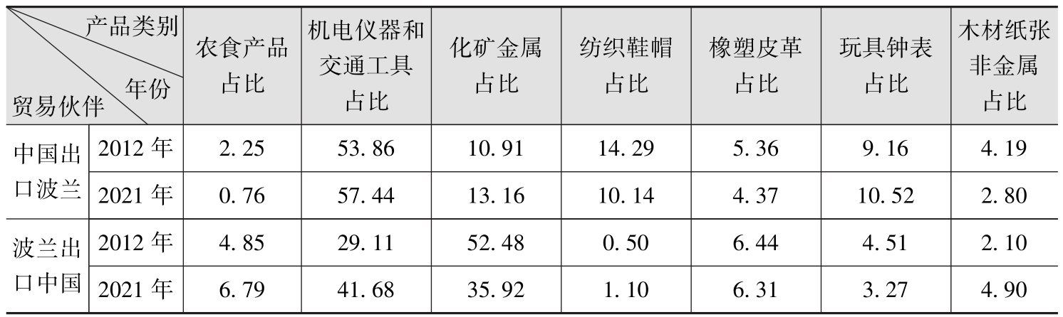 从表1.3中可以看出:(1)相较于2012年,2021年双边出口贸易的前三大产品的类别没有变化,但前三大产品集中度略有下降,且下降趋势主要体现在第一大贸易品,即机电仪器和交通工具类产品(HS84~93章)上,表明该类产品的市场竞争优势弱化;(2)中国出口波兰的第一大类产品(机电仪器和交通工具类)相对比较优势有所强化,但第二大类产品(纺织鞋帽类)占比则下降超4个百分点,其第二大贸易品的地位已让位于化矿金属类产品,与此同时,波兰出口中国则呈现反向变化趋势,其化矿金属类产品的相对比较优势明显弱化,出口占比从52.48%下降至35.92%;(3)双方在彼此市场出口产品类别有较大的相似性,机电仪器和交通工具类产品均是双边出口占比最大的品种,但波兰对中国出口产品中农食类产品已取代橡塑皮革类产品,占据出口第三大贸易品地位,这与合作机制框架下中国与中东欧国家间针对农产品的贸易便利化措施的实施密不可分。