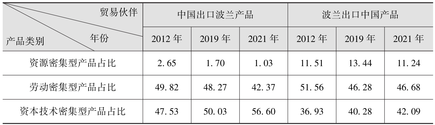 从表1.2中可以看出:(1)中国出口波兰产品中初级产品(资源密集型产品)占比非常低,而且还在不断降低,劳动密集型产品占比呈下降趋势,资本技术密集型产品比重有明显的上升,且在2019—2021年加速了这一变化趋势,这表明中国出口波兰产品的结构得到了明显的优化,高附加值出口产品比值稳步提升;(2)波兰出口中国产品结构变化趋势和中国的情况大体相同,出口结构同样得到了一定程度的优化,不同的是2019—2021年趋势变化不如中国变化得明显;(3)同中国出口结构相比,波兰出口中国产品中资源密集型产品和劳动密集型产品占比较高,在一定程度上说明了波兰的资本技术密集型产品同中国相比竞争力还比较弱。